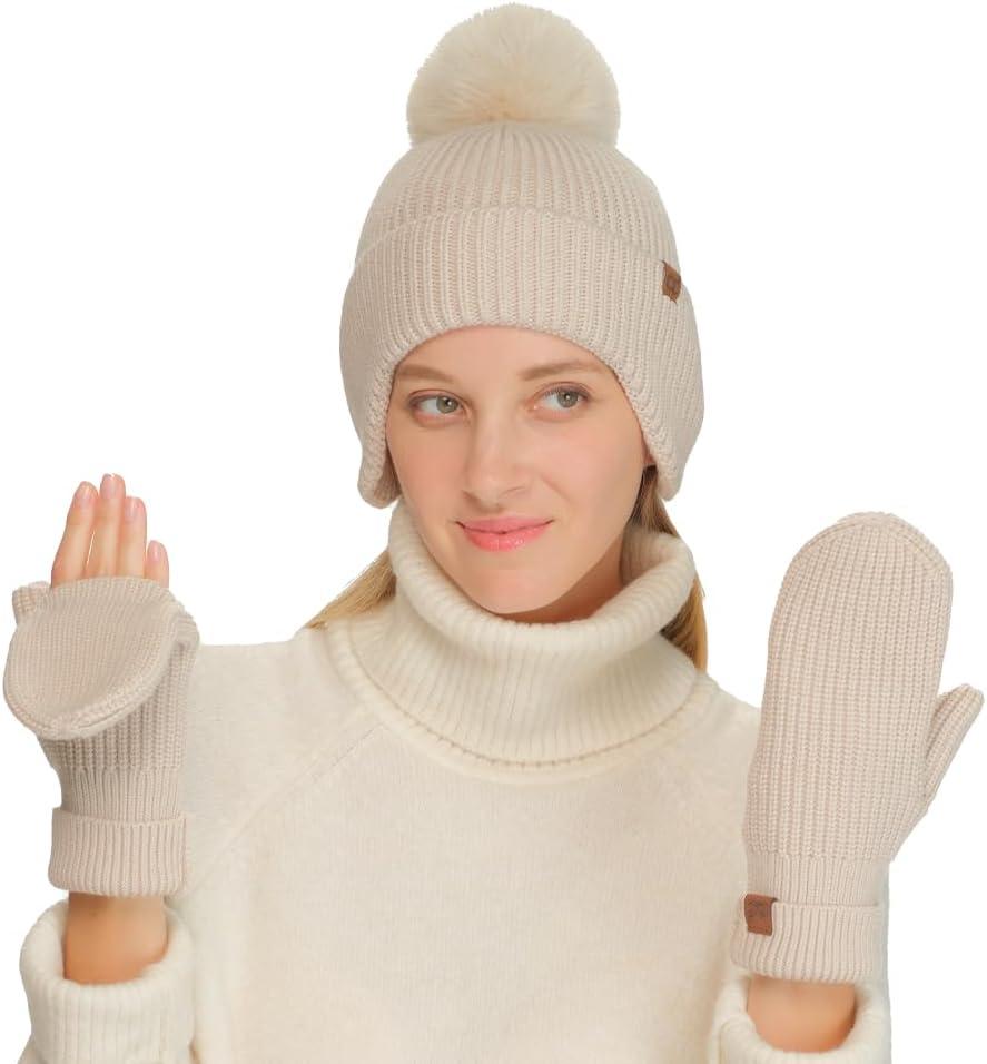 C.C Waffle Knit Mittens For Women – Acrylic Stretchable Soft Warm Knit Cold weather Winter Gloves(Convertible – Beige)