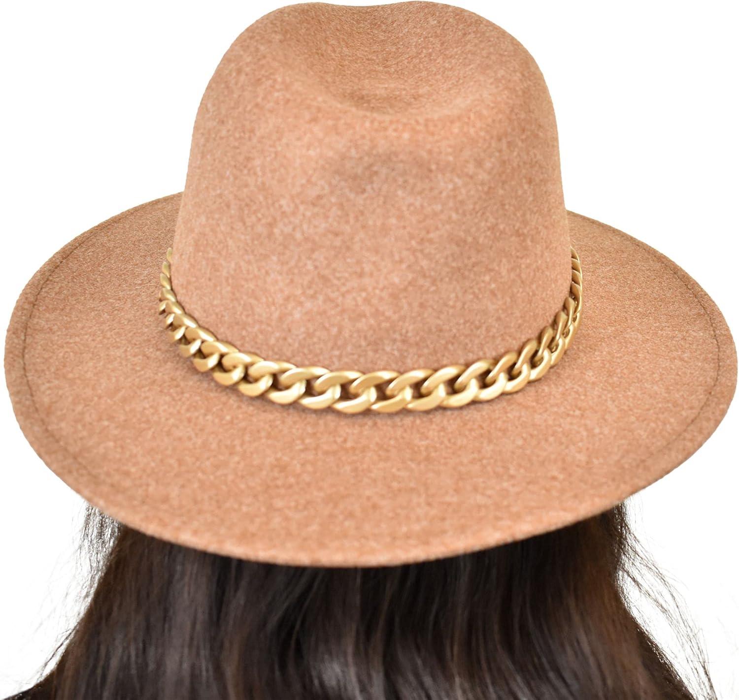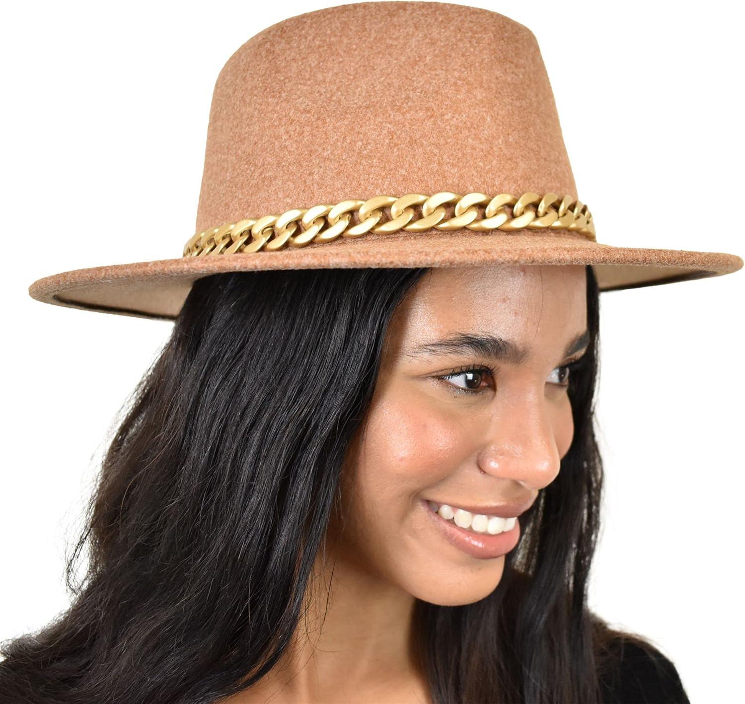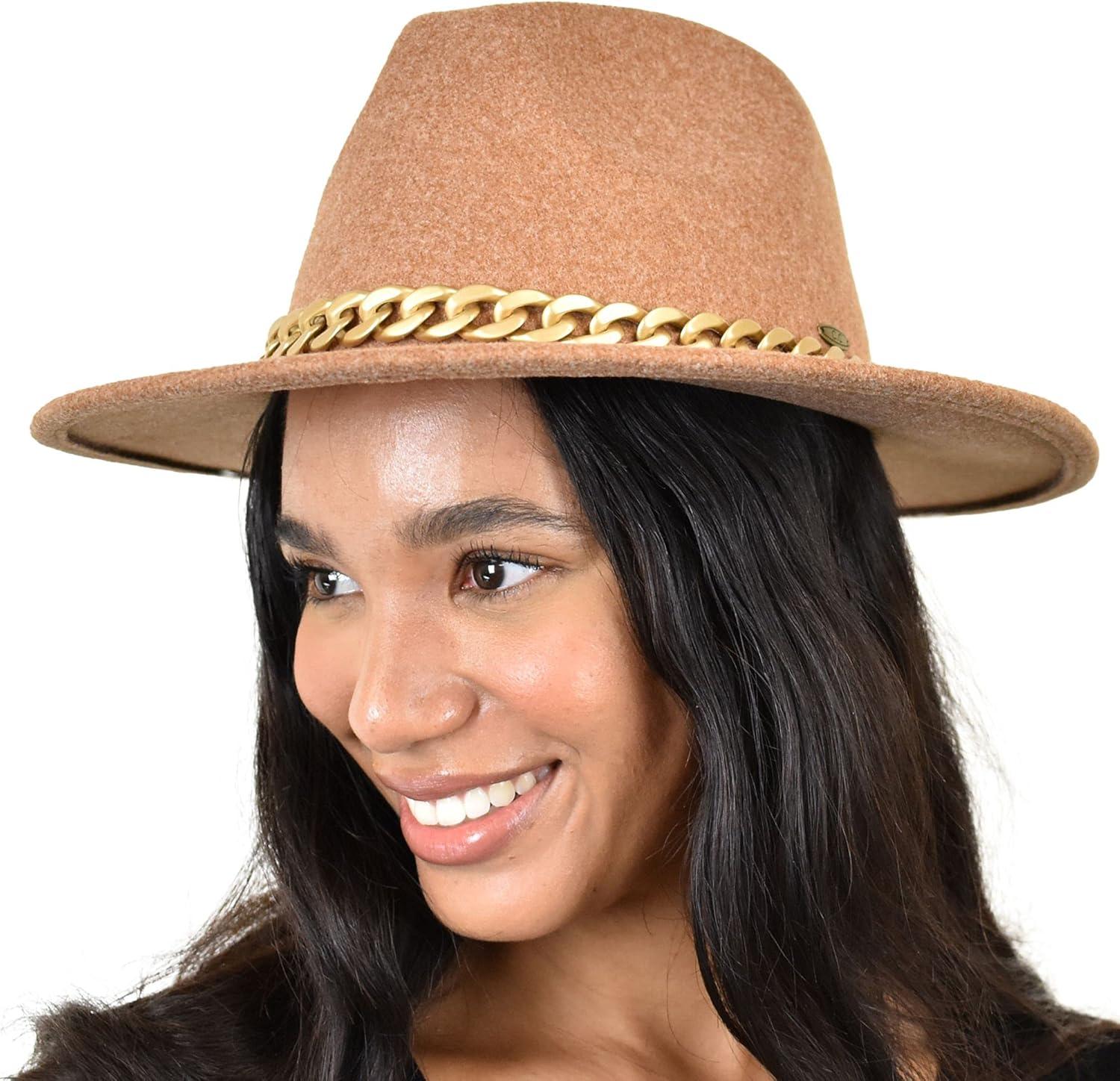 C.C Wide Brim Wool Fabric Panama Fedora Hat with Chain Accent(Heather Camel)