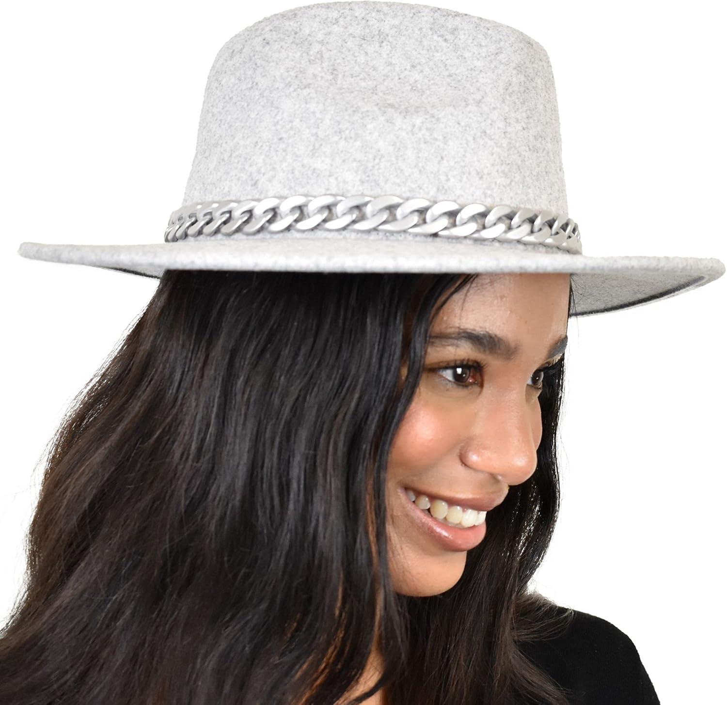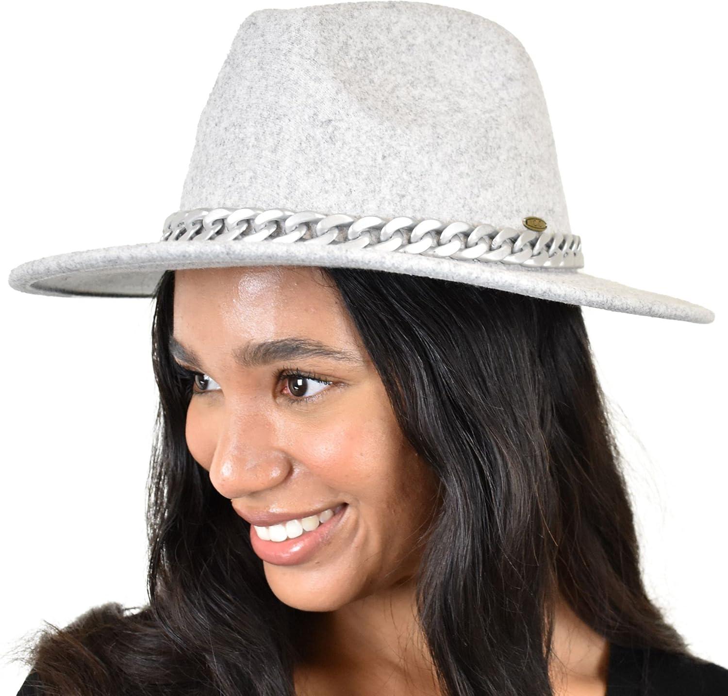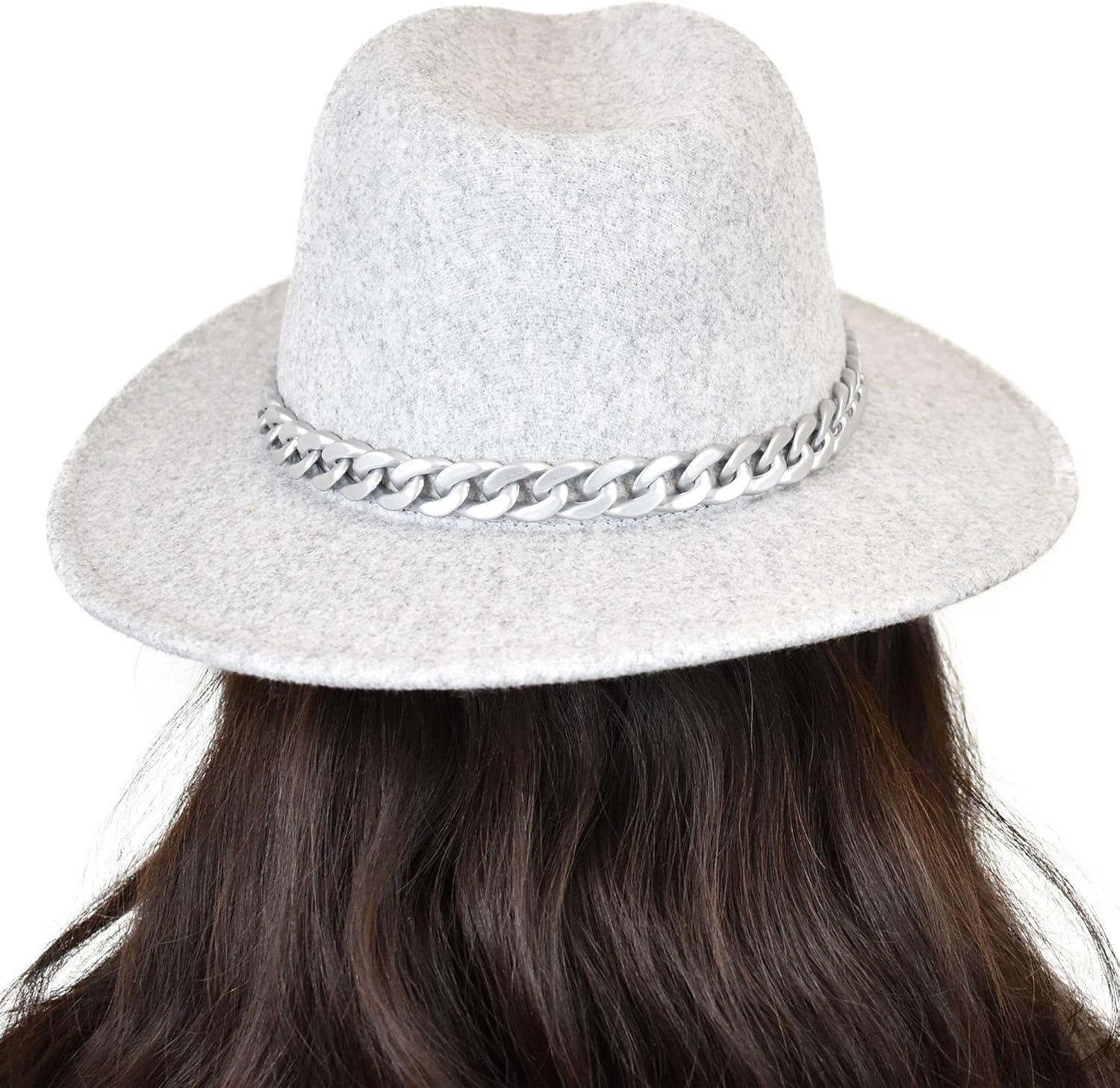 C.C Wide Brim Wool Fabric Panama Fedora Hat with Chain Accent(Heather Dove)