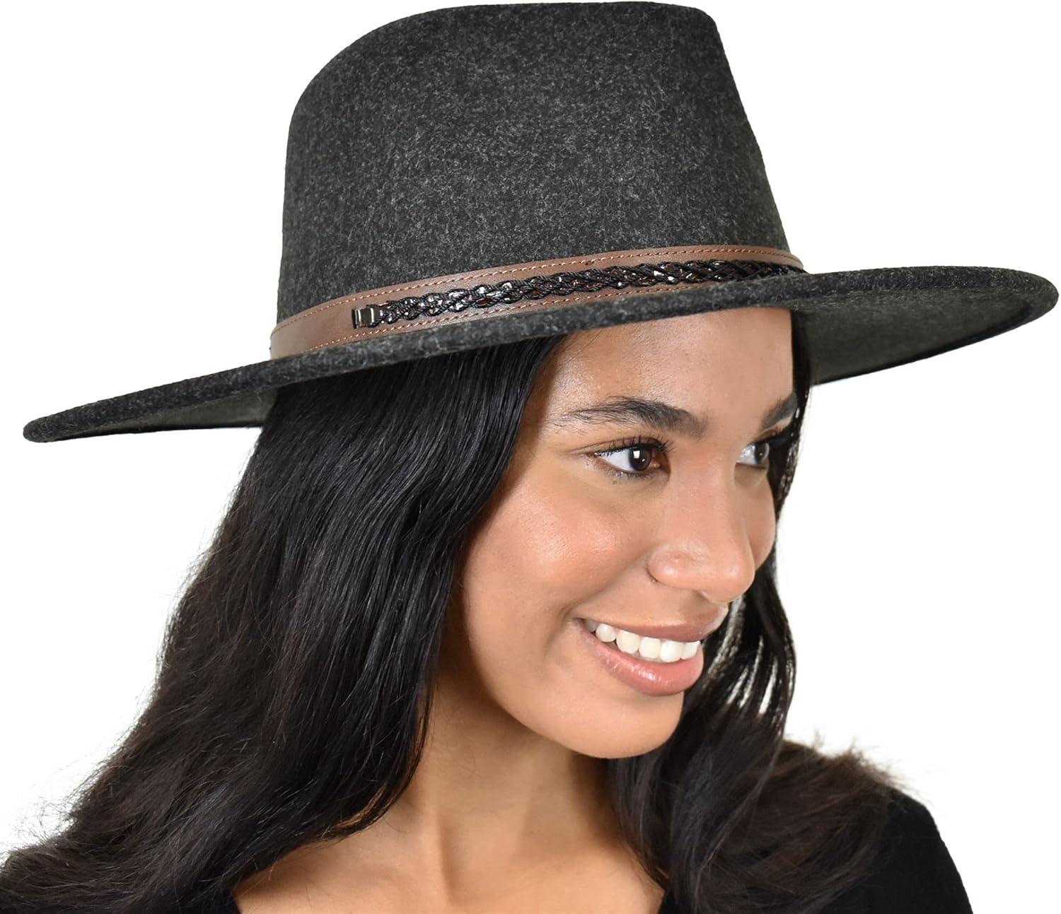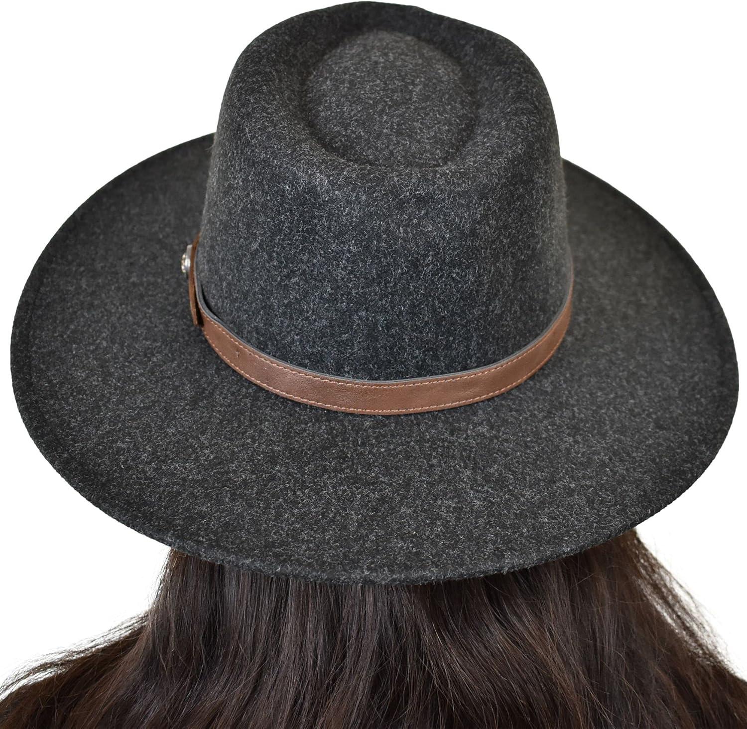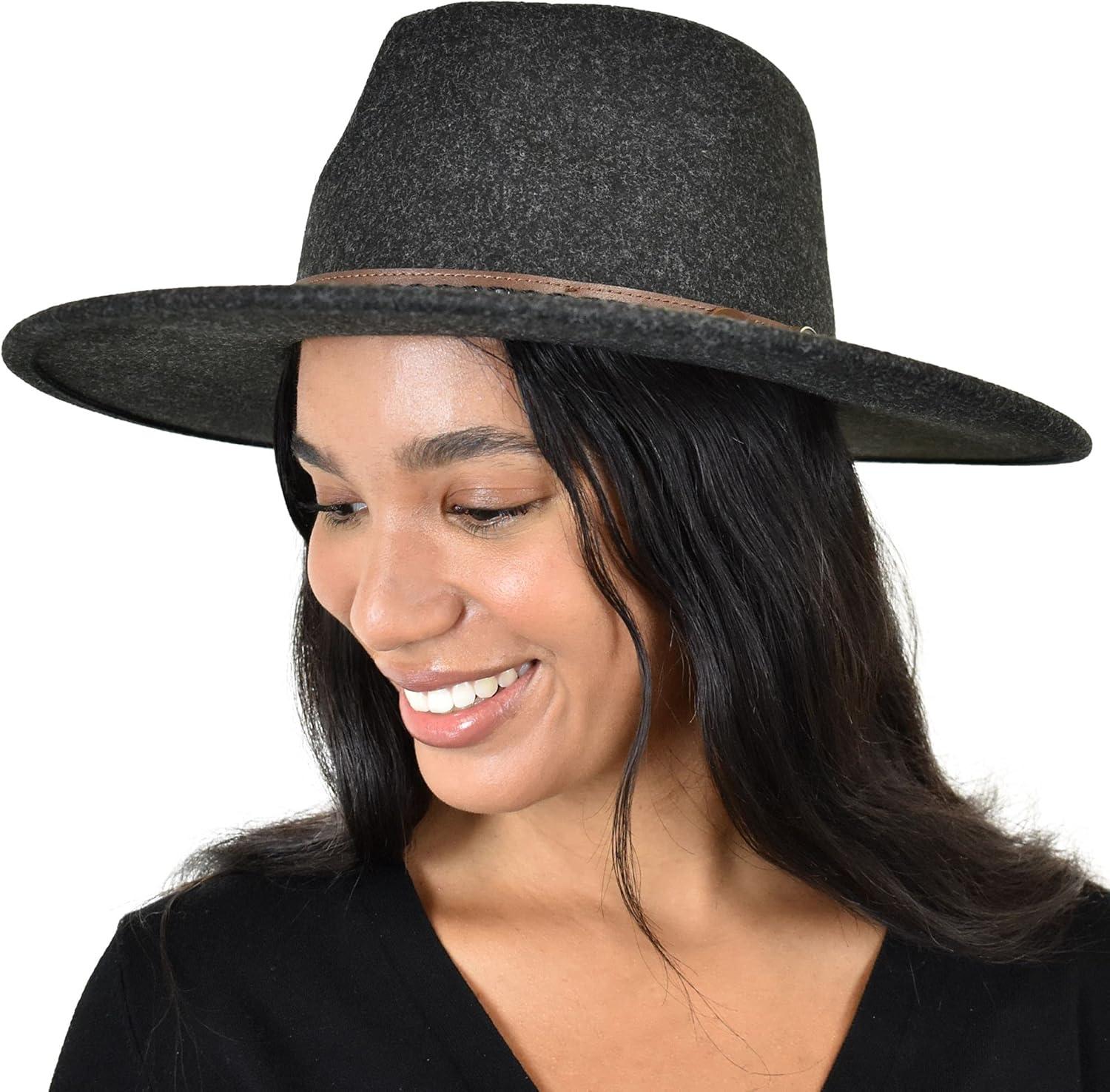 C.C Wide Brim Wool Fabric Panama Fedora Hat with Faux Leather Band Accent(Heather Black)
