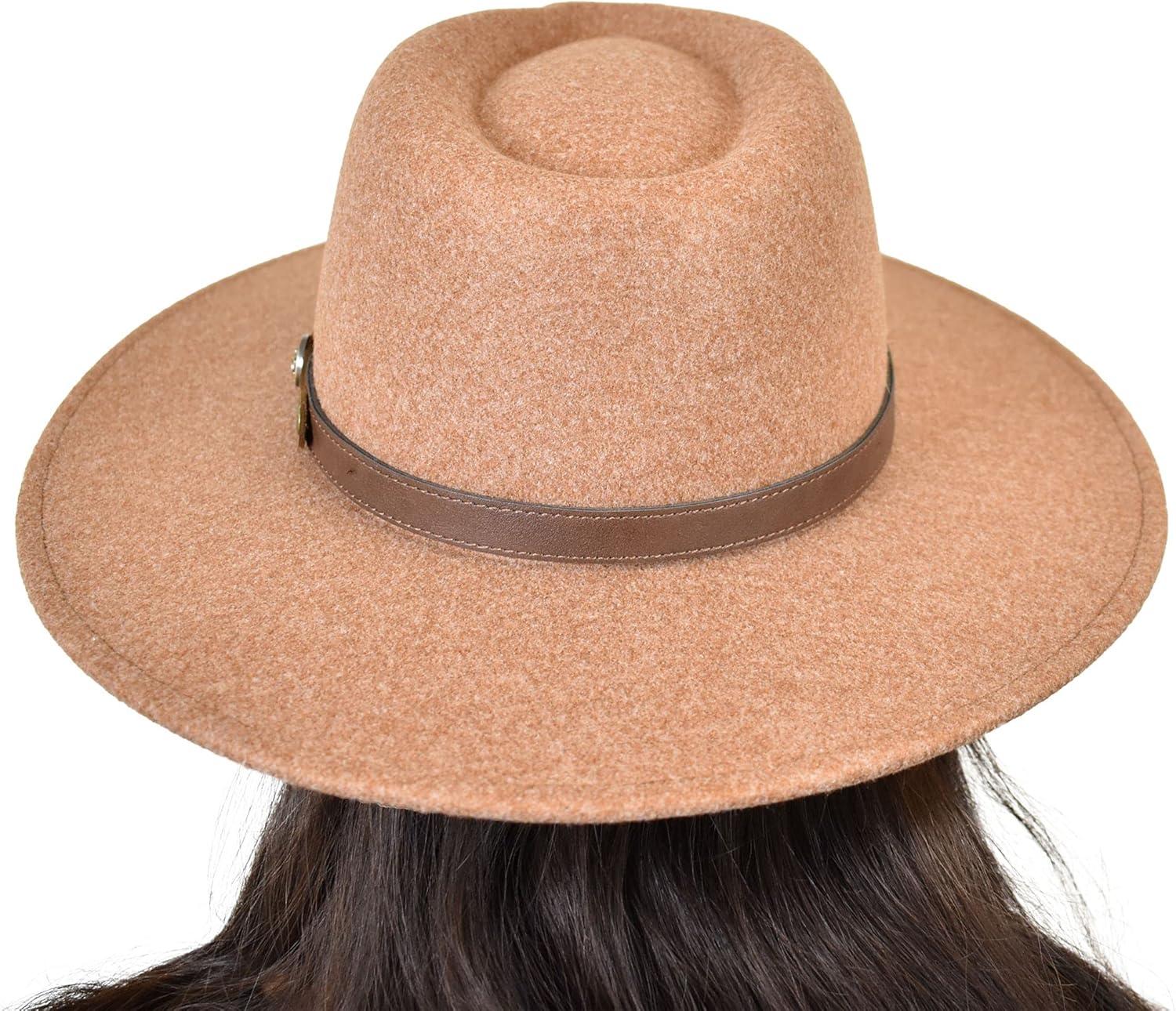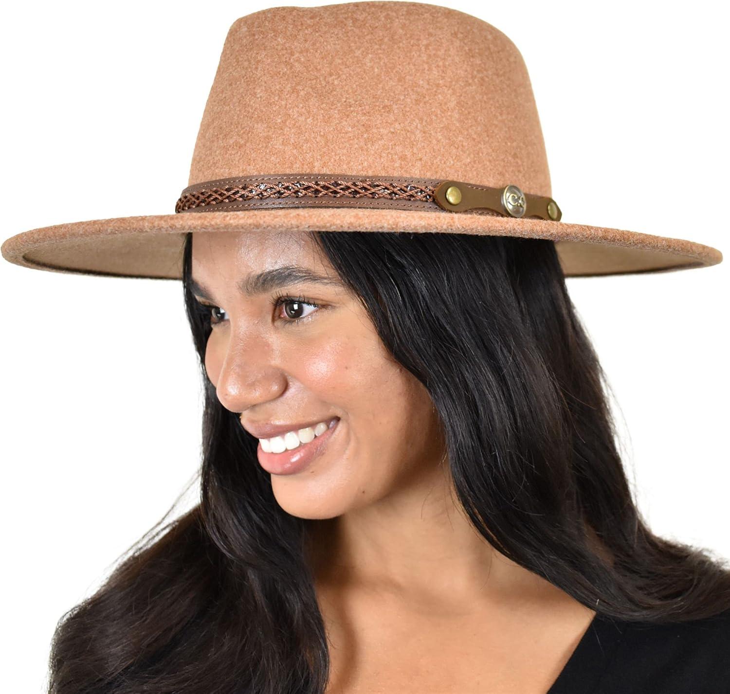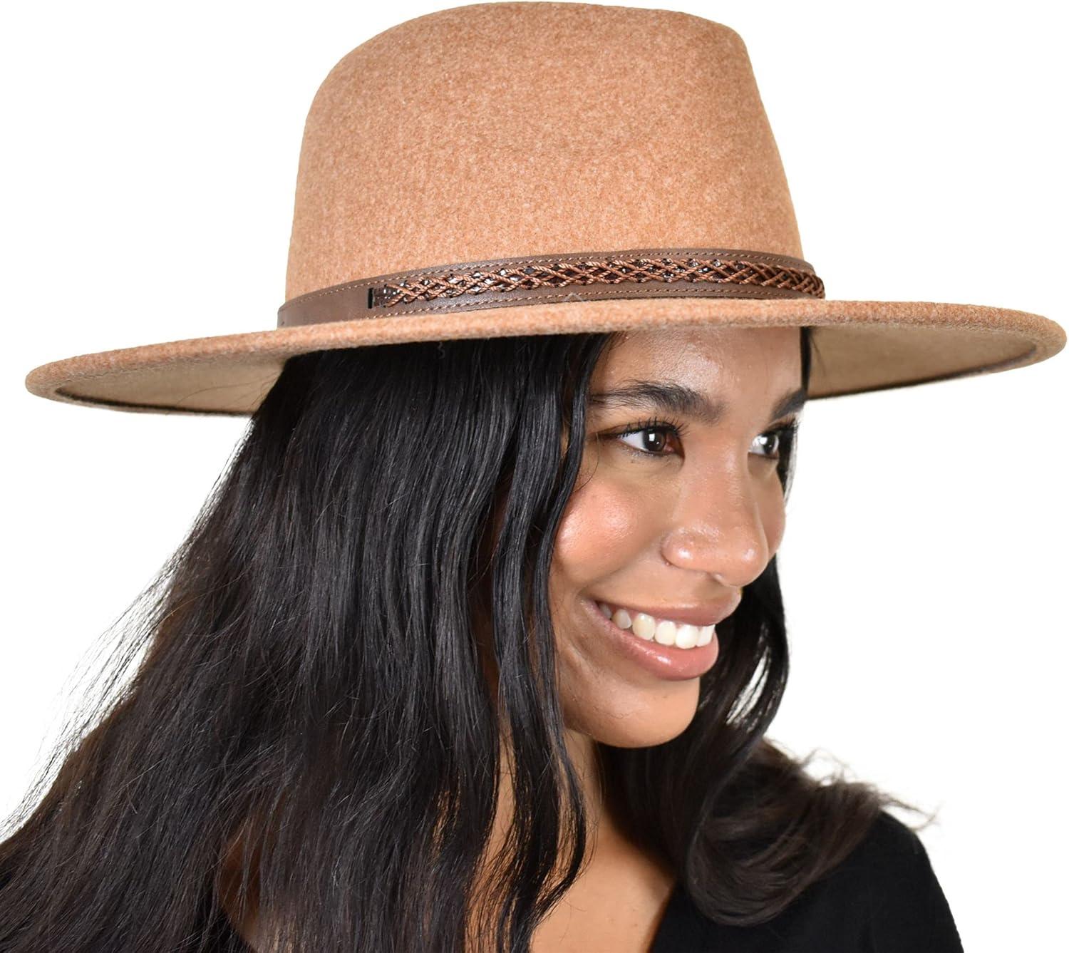 C.C Wide Brim Wool Fabric Panama Fedora Hat with Faux Leather Band Accent(Heather Camel)