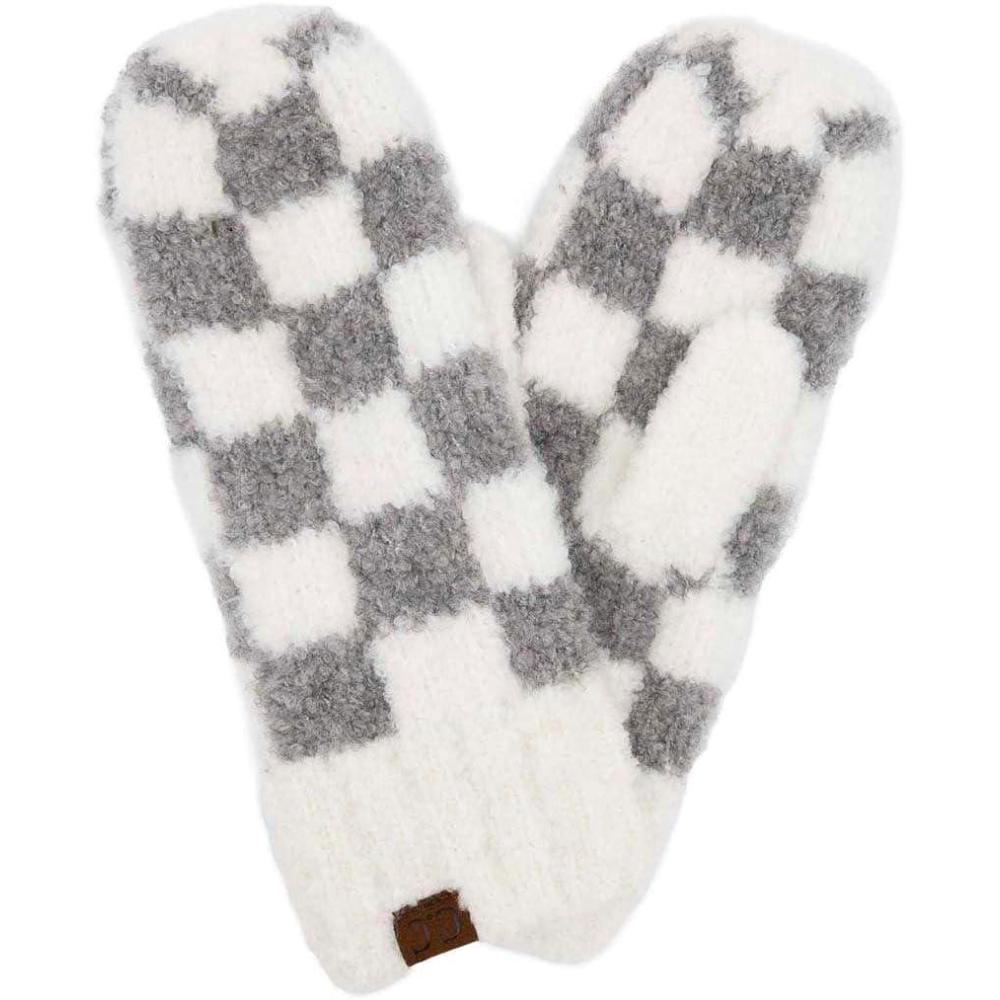 C.C Winter Warm Eco-Friendly Recycled Yarn Mittens(Checkered Light Gray/White)