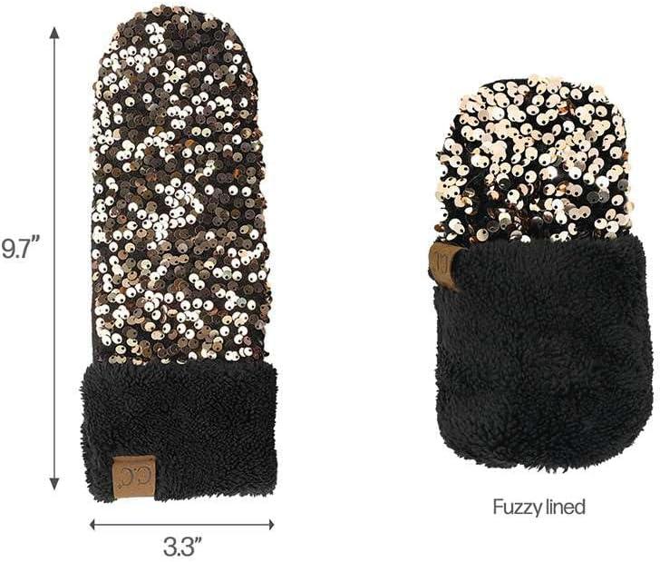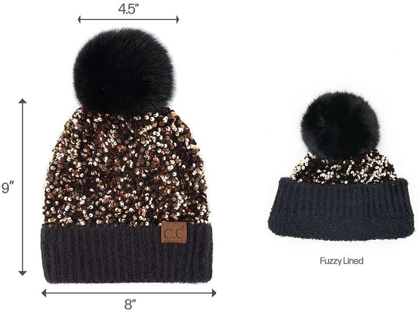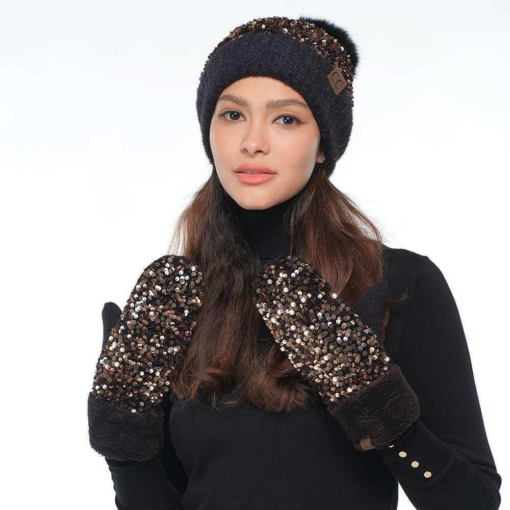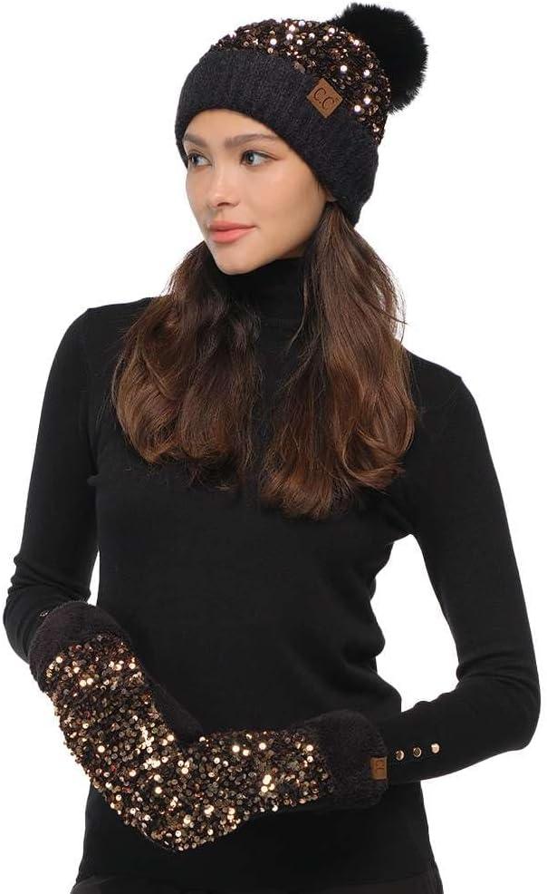 C.C Women Fuzzy Lined Sequin Fur Pom Beanie & Mitten Set(Sequin Black)