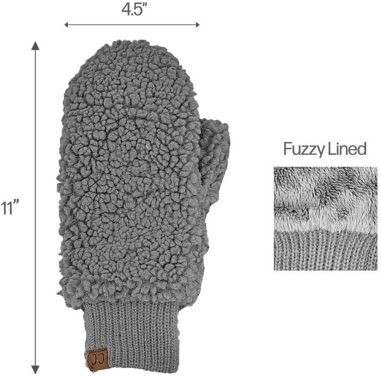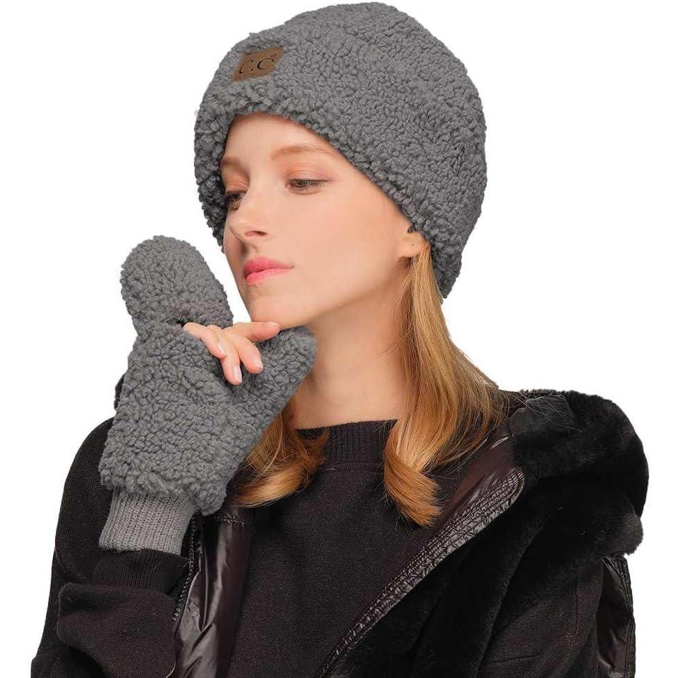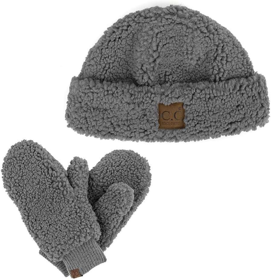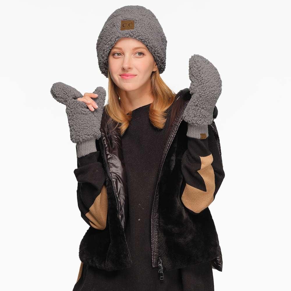 C.C Women Fuzzy Lined Sherpa Cuff Warm Winter Beanie and Mitten Set(Grey)