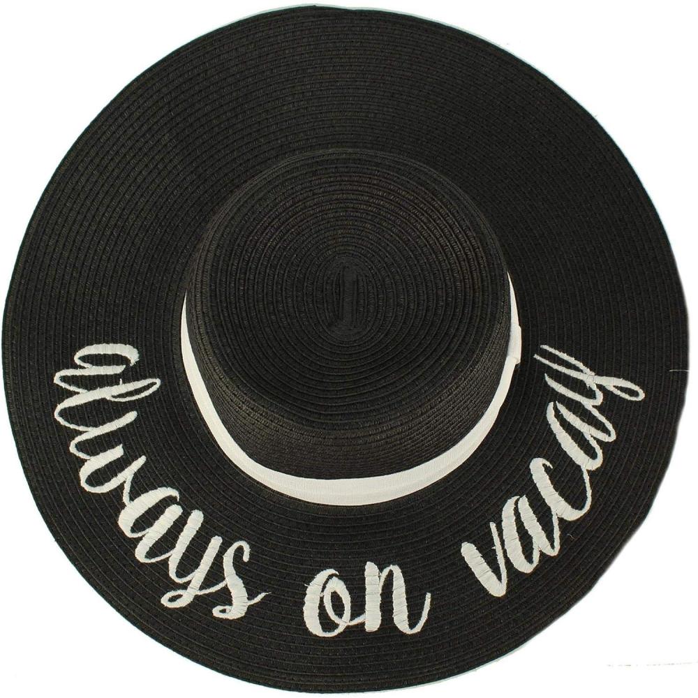 C.C Women's Paper Weaved Crushable Beach Embroidered Quote Floppy Brim Sun Hat(Always on Vacay Black)