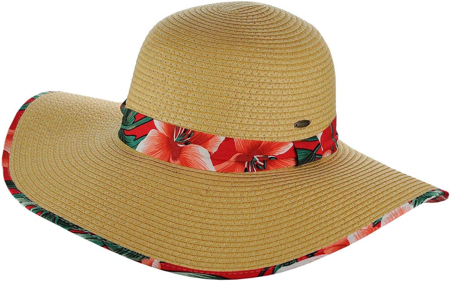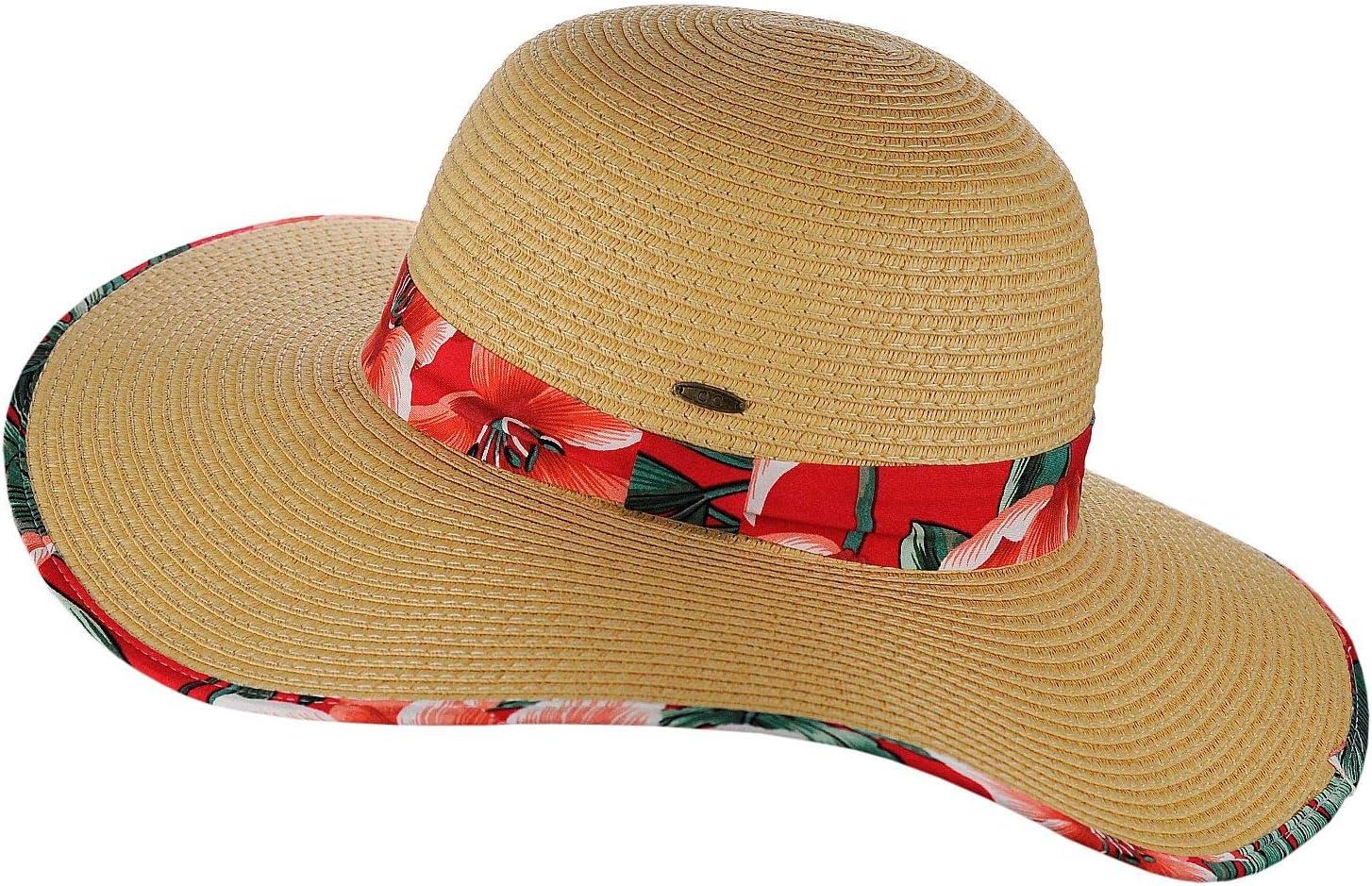 C.C Women’s Paper Weaved Crushable Beach UPF 50+ Floppy Brim Sun Hat with Print(Lily Red)