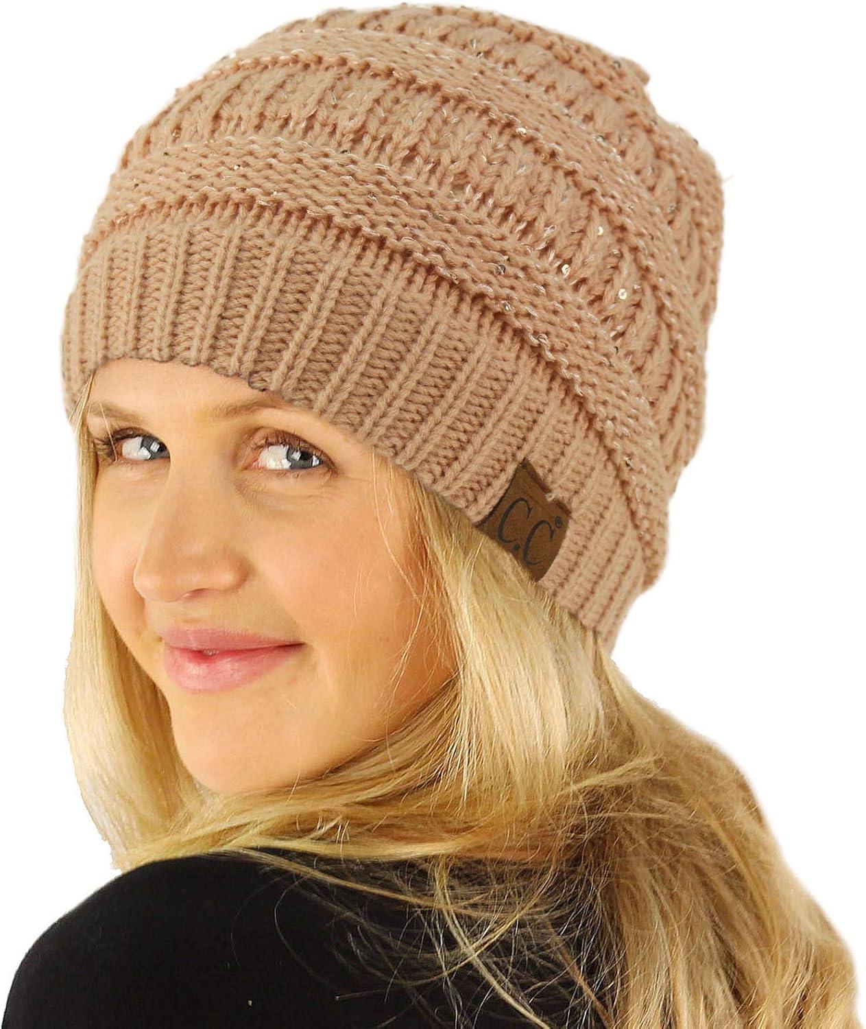 CC Classic Winter Fall Trendy Chunky Stretchy Cable Knit Beanie Hat(Sequins Beige)