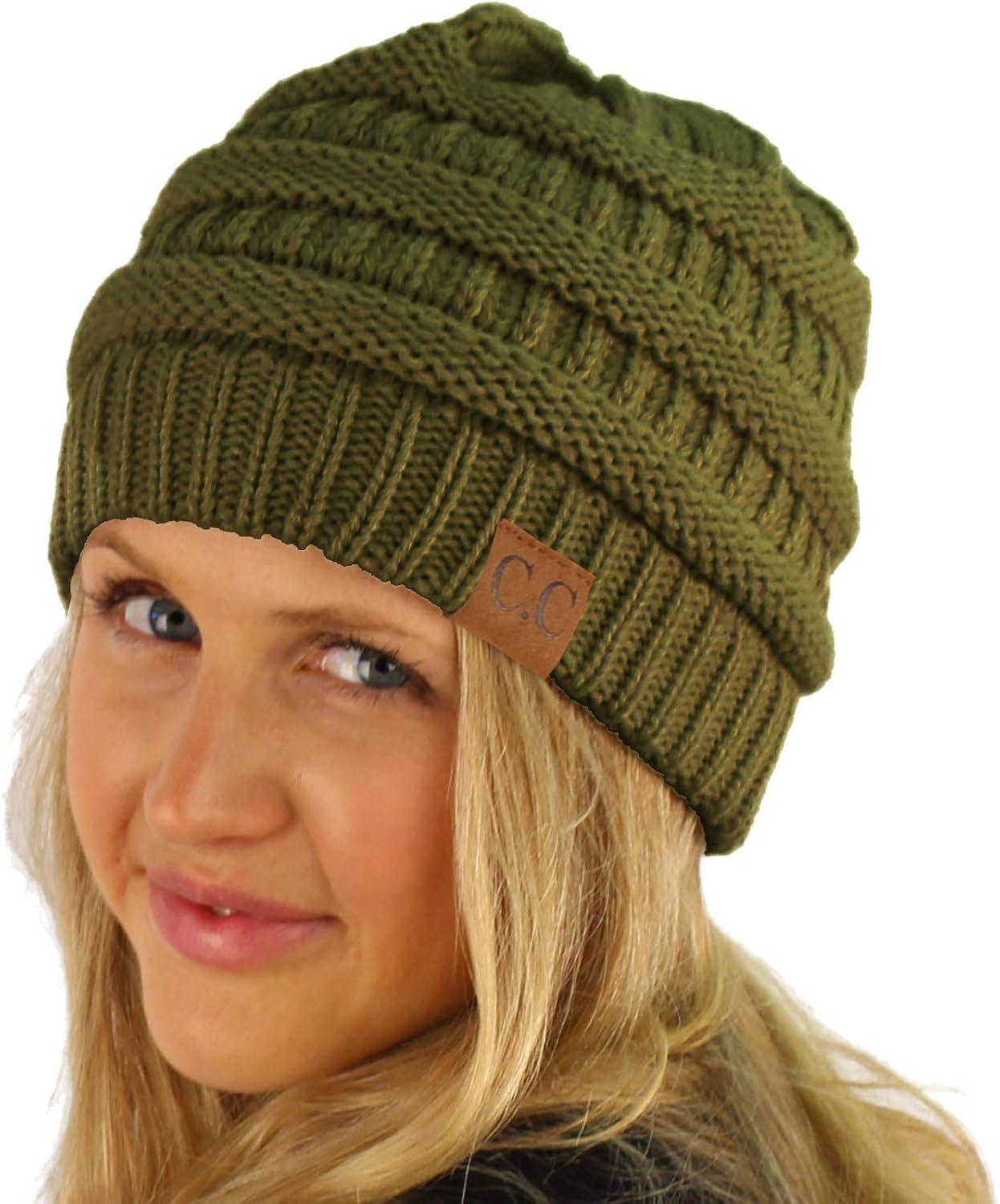 CC Classic Winter Fall Trendy Chunky Stretchy Cable Knit Beanie Hat(Solid Olive)