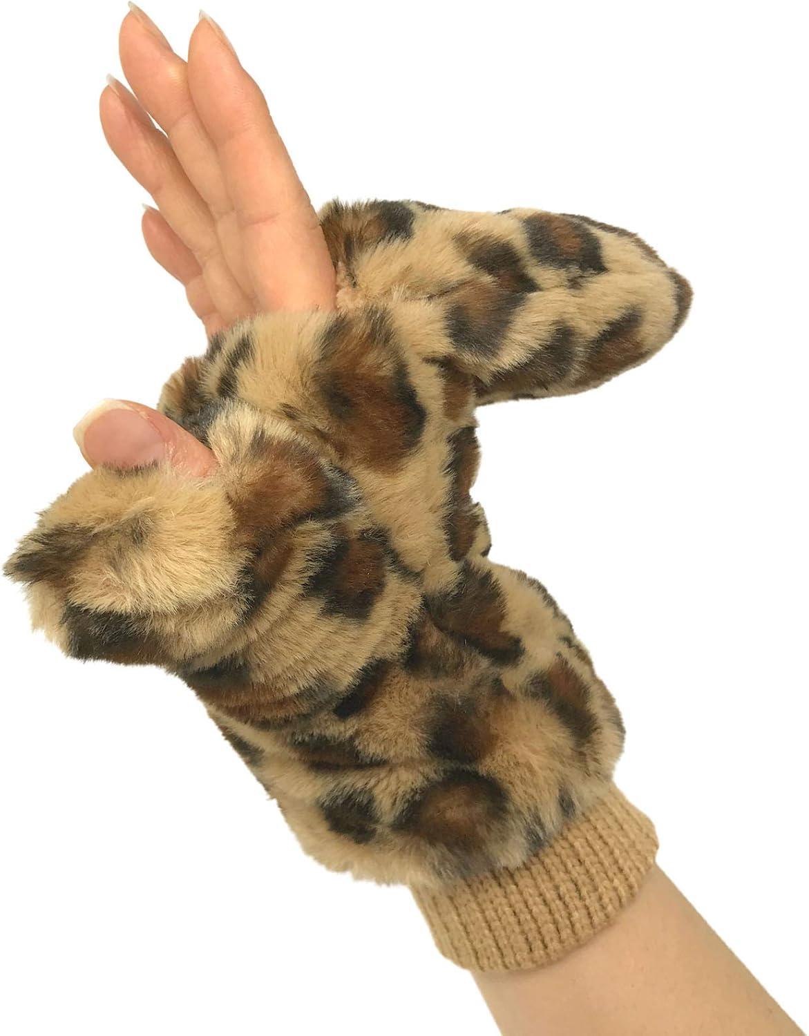imageCC Soft Faux Fur Fuzzy Lined Flip Up Down Top Fingerless Mitten Gloves Leopard Latte