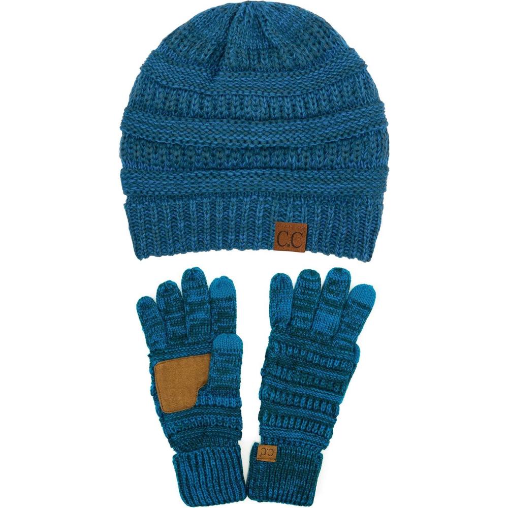 Unisex Soft Stretch Cable Knit Beanie and Anti-Slip Touchscreen Gloves 2 Pc Set(2 Tone Blue/Teal)