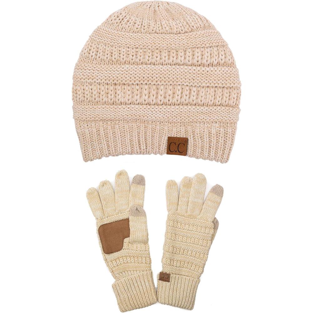 Unisex Soft Stretch Cable Knit Beanie and Anti-Slip Touchscreen Gloves 2 Pc Set(Beige)