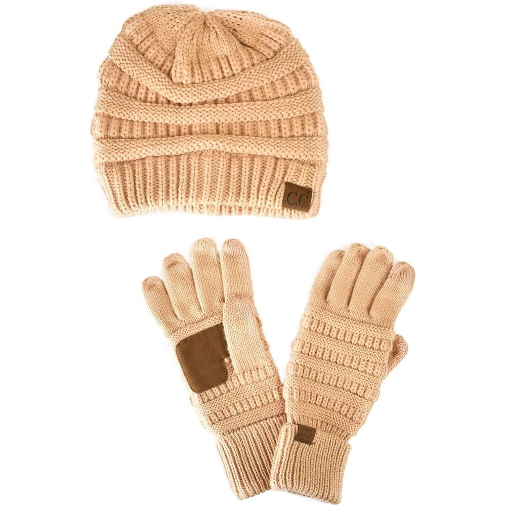 Unisex Soft Stretch Cable Knit Beanie and Anti-Slip Touchscreen Gloves 2 Pc Set(Sand)