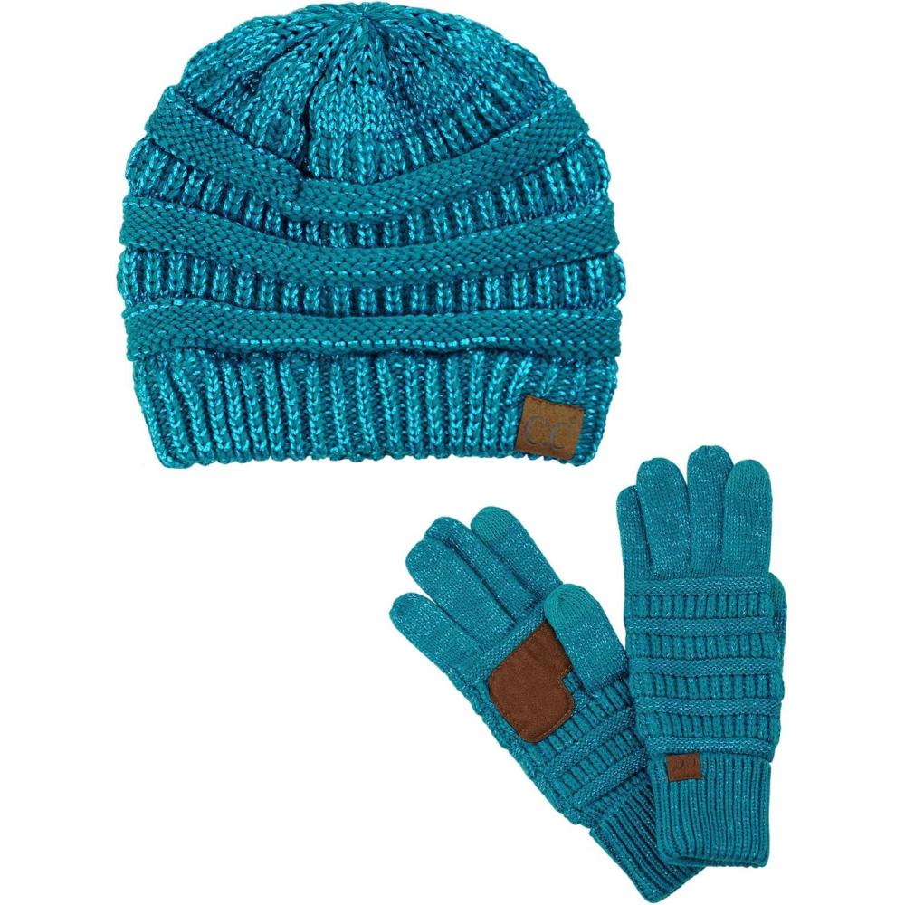 imageUnisex Soft Stretch Cable Knit Beanie and AntiSlip Touchscreen Gloves 2 Pc SetTeal Metallic