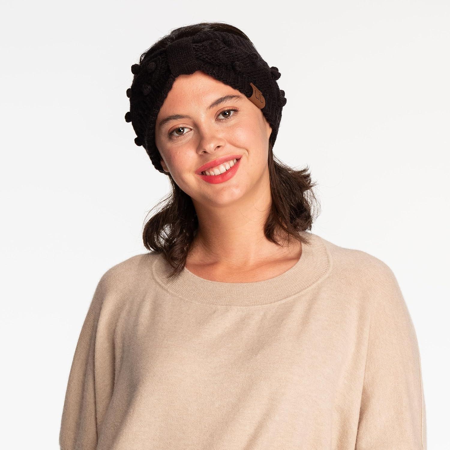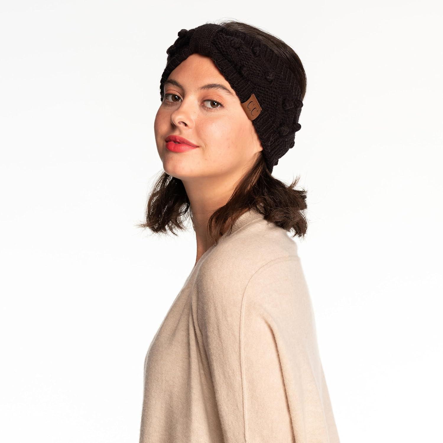 Winter CC Confetti Warm Fuzzy Fleece Lined Thick Knit Headband Headwrap Hat Cap(2ply Handmade Bobble Black)